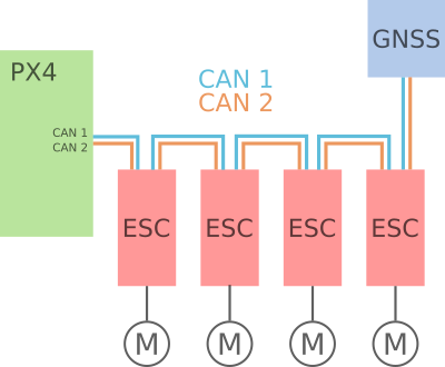 The following instructions provide a step-by-step guide to connect and setup a quadcopter with ESCs and GPS connected via UAVCAN. The hardware of choice is a Pixhawk 2.1, Zubax Orel 20 ESCs and a Zubax GNSS GPS module.