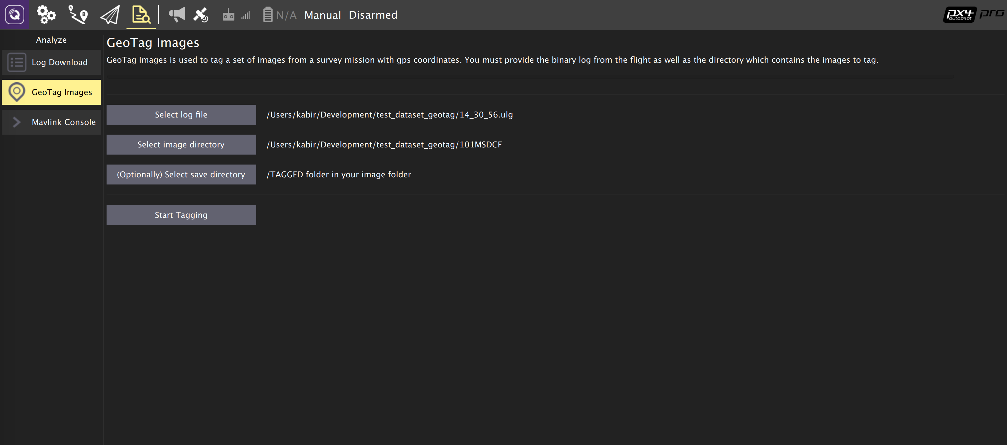 Download/copy the logfile and images from the flight and point QGroundControl to them. Then click on "Start Tagging".