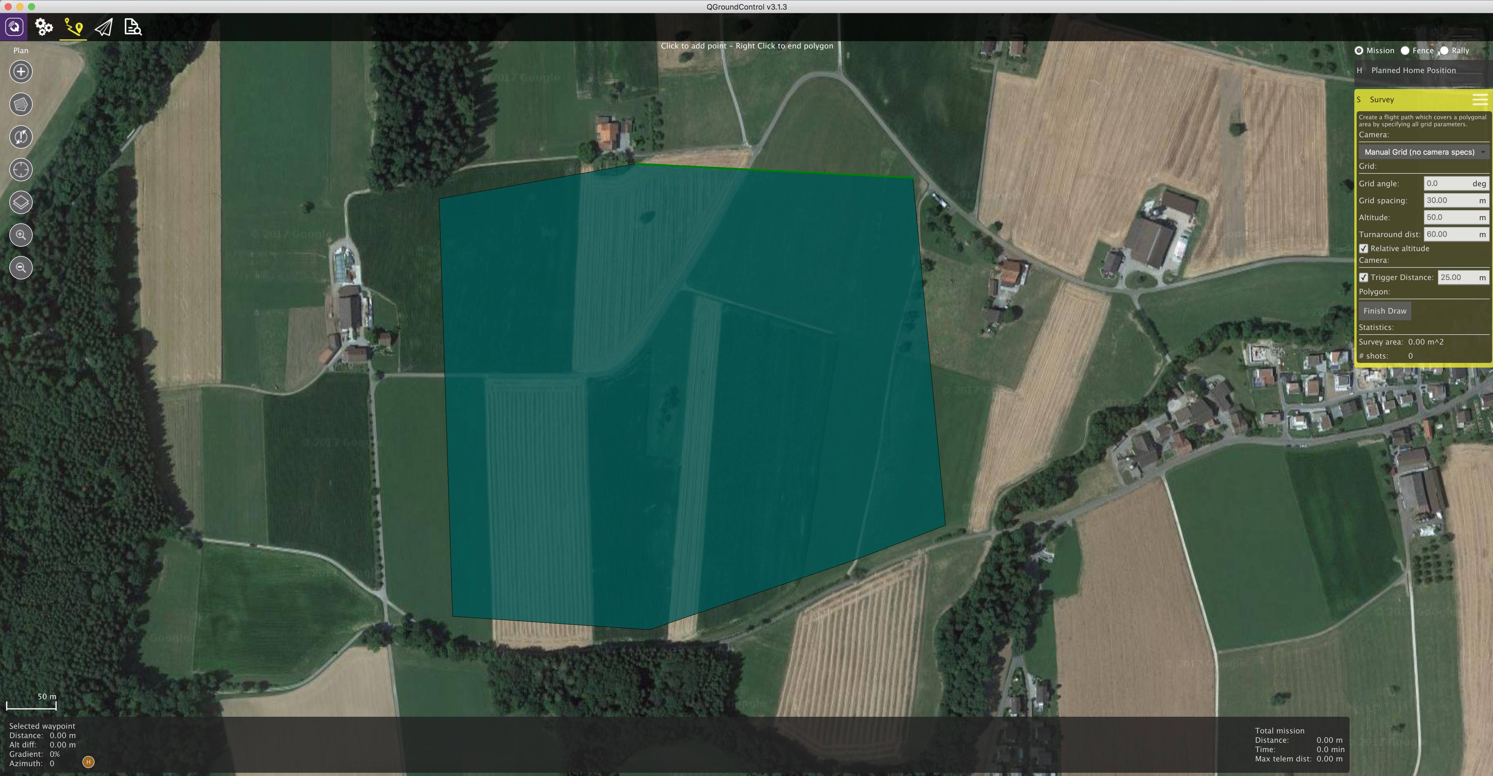 • TRIG_MODE 3은 거리 기반한 트리거입니다. 설정한 수평 거리를 초과할 때마다 사진을 찍습니다. 사진을 찍는 시간 간격은 triggering interval 설정으로 제한됩니다.